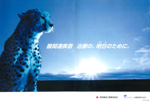 広告のビジュアルは、地上最速の生物チーター。「強い」「速い」という製品の特徴を捉えたキービジュアルになっています。ブルーのチーターがカッコイイですね。細胞のような青い球体は、酵素のイメージで【プロトンポンプ】を表現しているのだと思います。